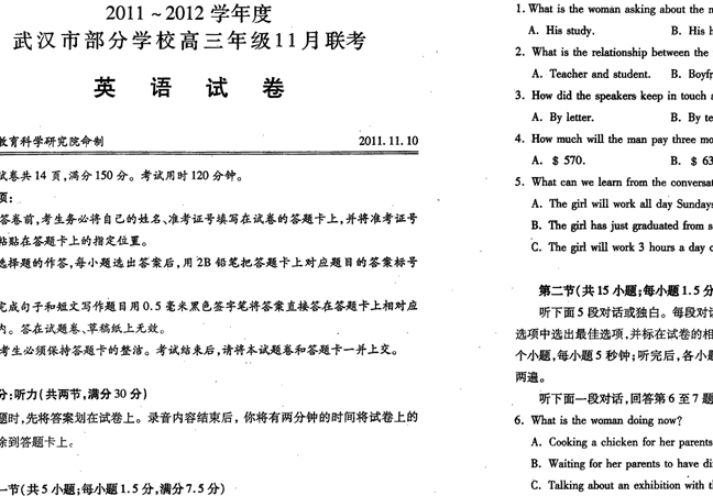 百度:湖北省武汉市部分学校2012届高三11月联考 英语 扫描版