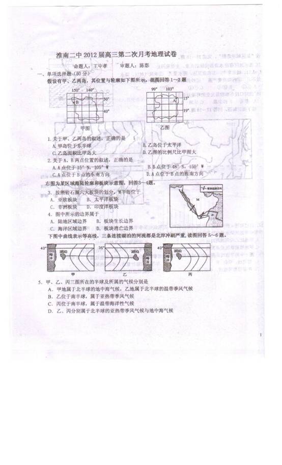 谷歌:安徽省淮南市二中2012届高三第二次月考(地理)(扫描版)