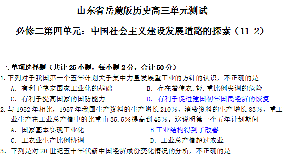 百度:【KS5U独家】山东省2012届高三历史必修2第4单元检测2(岳麓版)