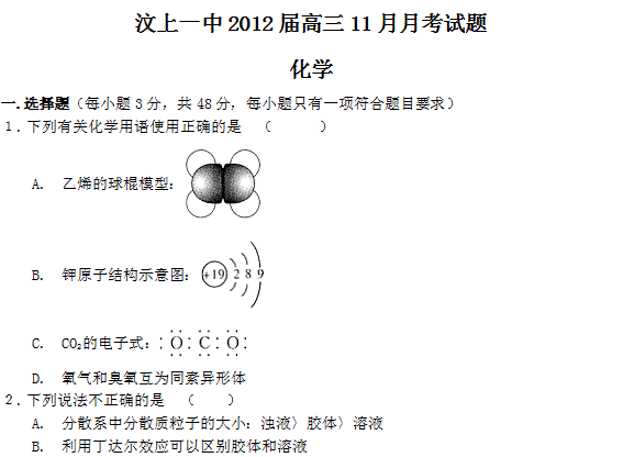 谷歌:【KS5U首发】山东省济宁市汶上一中2012届高三11月月考 化学试题