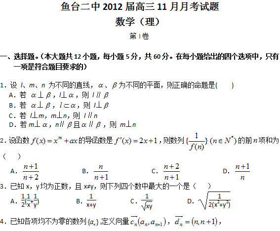 百度:【KS5U首发】山东省济宁市鱼台二中2012届高三11月月考 理科数学试题