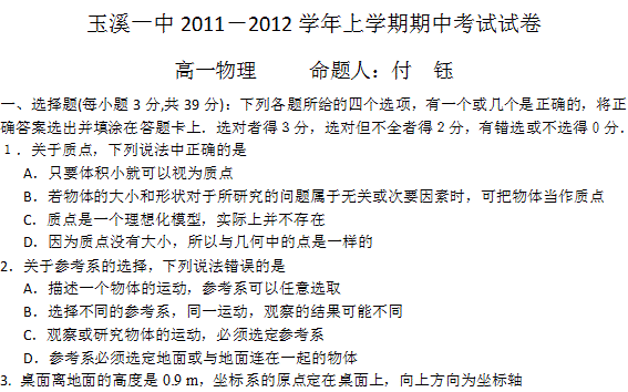 有道:【KS5U首发】云南省玉溪一中11-12学年高一上学期期中考试 物理试题