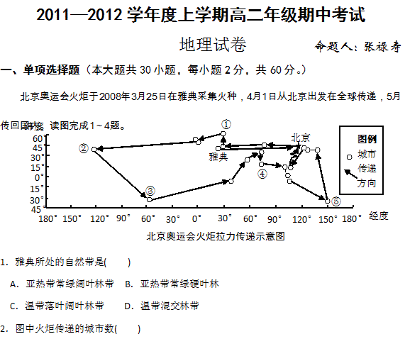 百度:【KS5U首发】云南省玉溪一中11-12学年高二上学期期中考试 地理试题