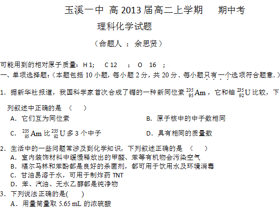 百度:【KS5U首发】云南省玉溪一中11-12学年高二上学期期中考试 理科化学试题