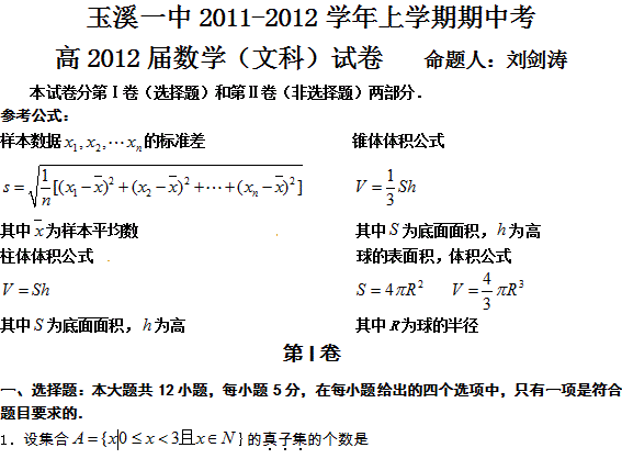 谷歌:【KS5U首发】云南省玉溪一中2012届高三上学期期中考试 文科数学试题