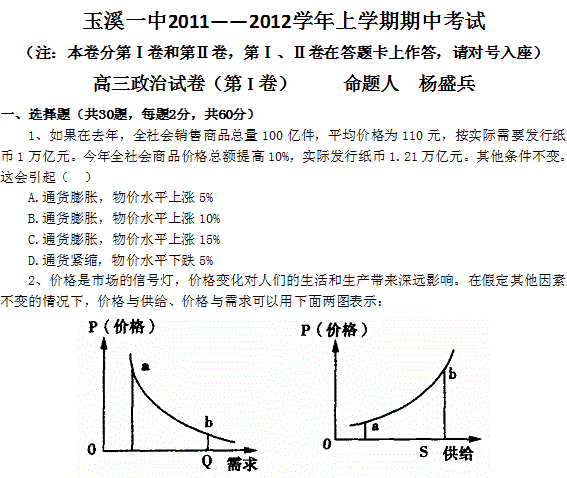 百度:【KS5U首发】云南省玉溪一中2012届高三上学期期中考试 政治试题