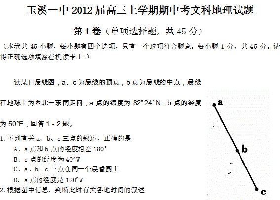 谷歌:【KS5U首发】云南省玉溪一中2012届高三上学期期中考试 地理试题