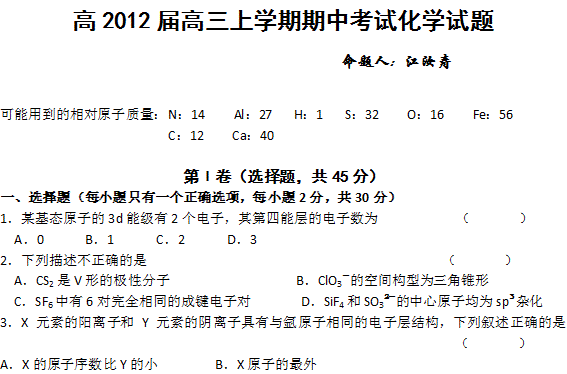谷歌:【KS5U首发】云南省玉溪一中2012届高三上学期期中考试 化学试题