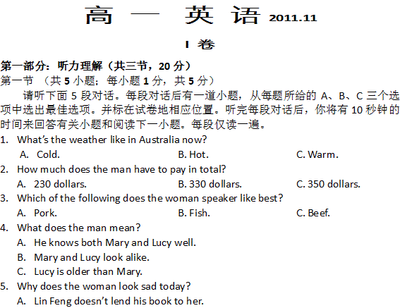 百度:【KS5U首发】北京市重点中学11-12学年高一上学期期中考试 英语试题含听力