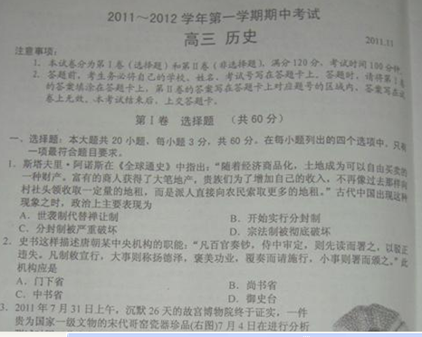 百度:江苏省苏州五市三区2012届高三上学期期中考试(历史)扫描版