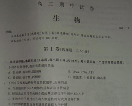 谷歌:江苏省苏州五市三区2012届高三上学期期中考试(生物)扫描版
