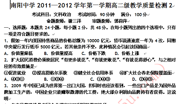 谷歌:广东省南阳中学11—12学年高二第一学期教学质量检测(2)政治(文)试题