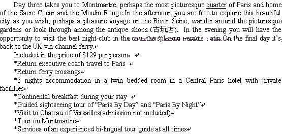 your break begins with executive coach (长途公共汽车) transfer from regional (各地的) pickup points and travel to paris is via crosschannel ferry (渡船), arriving at your hotel in the evening.the ibis is an excellent quality hotel with private facilities in all rooms: satellite tv, radio, telephone and alarm clock.it has a bar and restaurant and is situated about two miles south of notre dame enabling you to explore paris with ease.