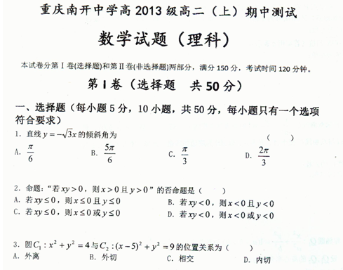 百度:重庆市南开中学11-12学年高二上学期期中考试(数学理)扫描版