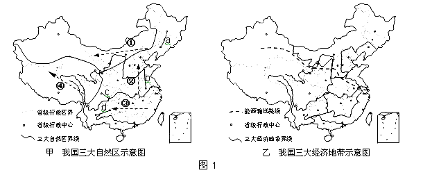 图1是我国三大自然区和经济地带示意图。读图完成1~4题。