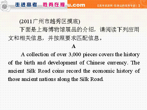 有道:2012届高中英语新课标2轮总复习(广东专版)课件:专题4 第2课时信息匹配的性质和特点