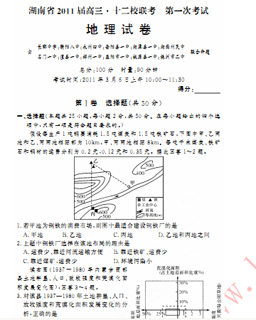 百度:湖南省十二校2011届高三第一次联考地理试题(扫描版)