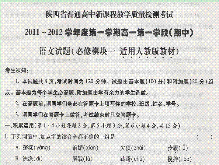 百度:【KS5U首发】陕西省西安市第一中学11-12学年高一上学期期中试题扫描版语文