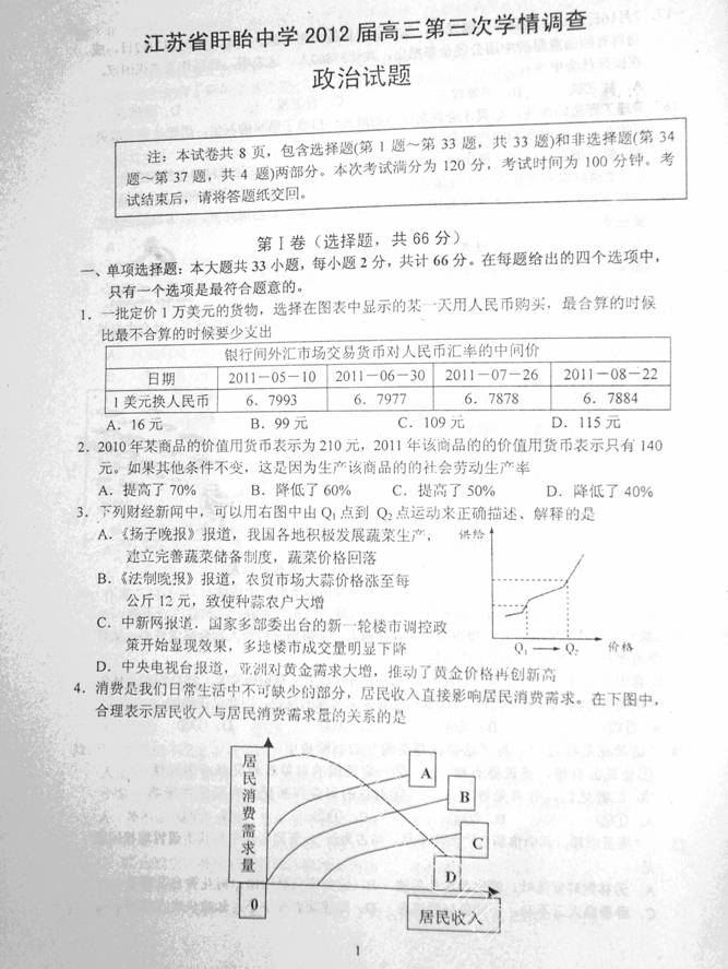 百度:江苏省盱眙中学2012届高三第三次学情调查政治试题(扫描版)
