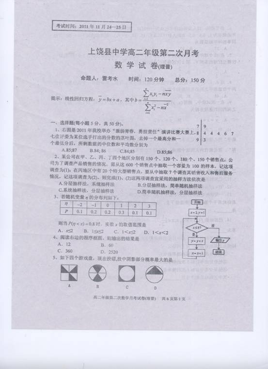 百度:江西省上饶县中学2011-2012学年高二第二次月考(数学理)(扫描版,普,无答案)