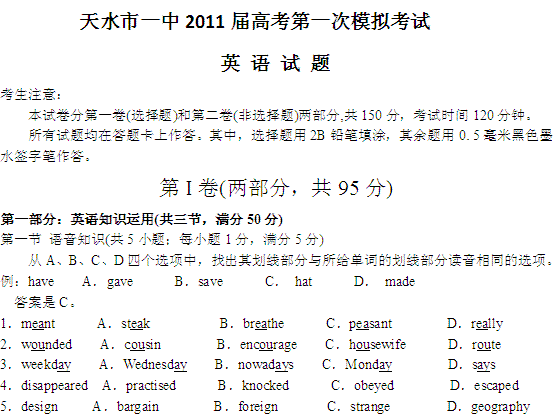 甘肃省天水一中2011届高三高考第一次模拟考试题英语