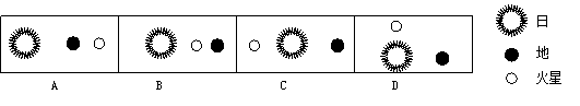 2.火星冲日,就是火星位于日地连线上,并且和地球同位于太阳的一侧。2003年8月29日,火星.地球和太阳依次排成一条直线,而且与太阳“此升彼落”。能反映29日火星.地球和太阳三者位置关系的示意图是( )