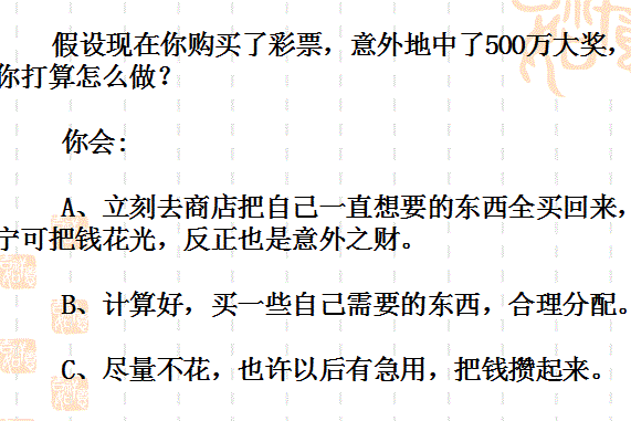 假设现在你购买了彩票,意外地中了500万大奖,你打算怎么做? 你会: a、立刻去商店把自己一直想要的东西全买回来,宁可把钱花光,反正也是意外之财。 b、计算好,买一些自己需要的东西,合理分配。 c、尽量不花,也许以后有急用,把钱攒起来。