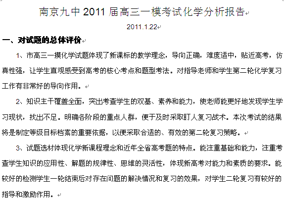 百度:江苏省南京市2011届高三一模化学学科分析报告南京九中
