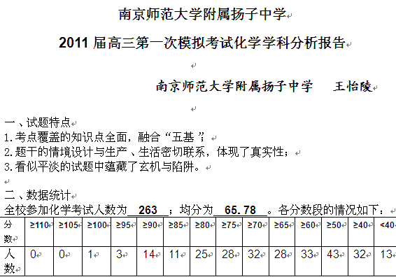 百度:江苏省南京市2011届高三一模化学学科分析报告南京师范大学附属扬子中学