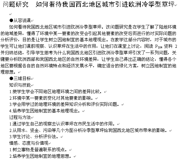 谷歌:10-11学年高一地理:5.3 问题研究 《如何看待我国西北地区城市引进欧洲冷季型草坪》教案(新人教版必修1)