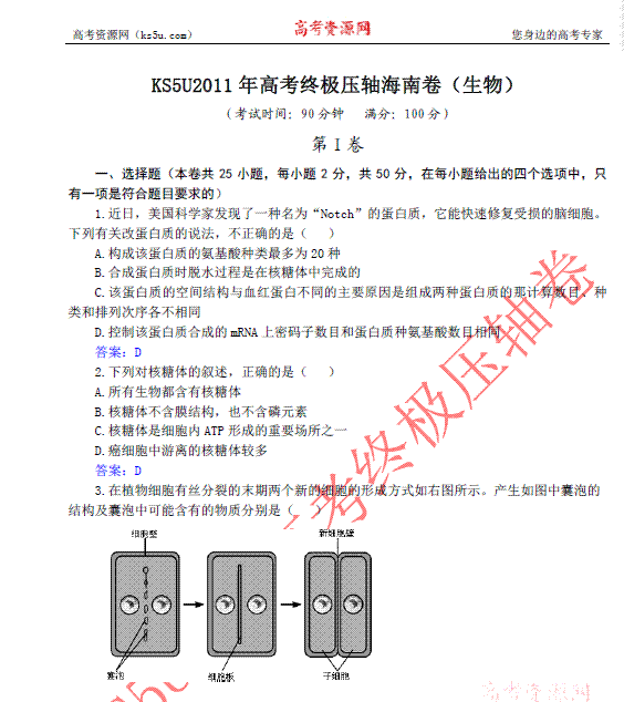 百度:KS5U2011年高考终极压轴海南卷(生物)