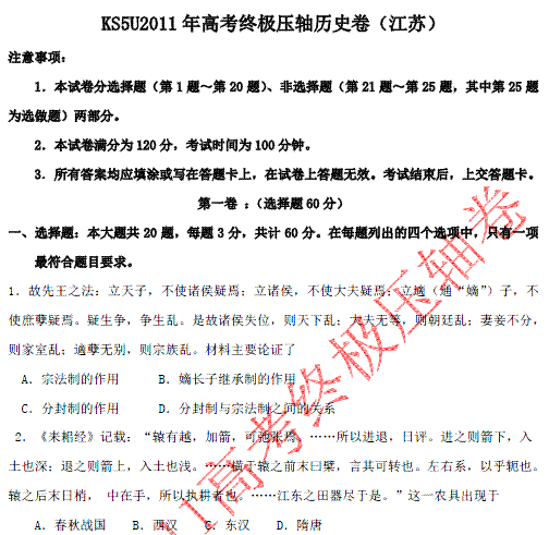 谷歌:KS5U2011年高考终极压轴江苏卷(历史)