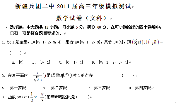 百度:新疆兵团二中2011届高三模拟测试(数学文)