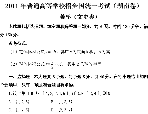 百度:2011年高考试题——数学文(湖南卷)精校版