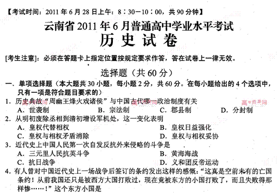 百度:云南省2011年6月普通高中学业水平考试(历史)(扫描版)(无答案)