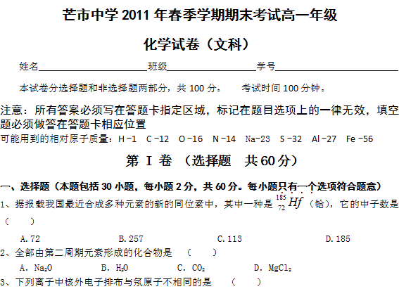 云南省芒市中学10-11学年高一下学期期末考试(化学文)云南省芒市中学10-11学年高一下学期期末考试(化学文)