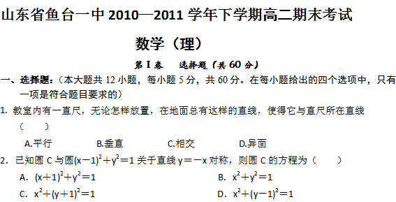 百度:山东省鱼台一中10-11学年高二下学期期末考试(理数)