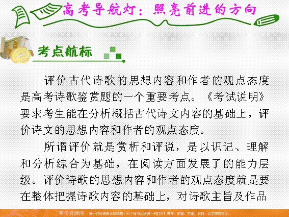 有道:2012届高考语文福建人教版学海导航新课标高中总复习(第1轮)课件:第3章第2节 评价古代诗歌的思想内容和作者的观点态度