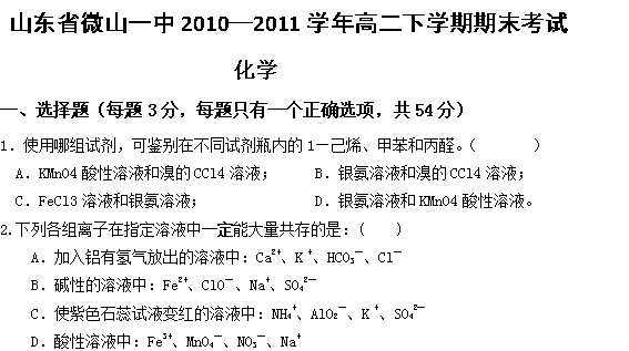 山东省微山一中10-11学年高二下学期期末考试(化学)山东省微山一中10-11学年高二下学期期末考试(化学)
