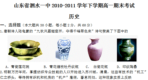 百度:山东省泗水一中10-11学年高一下学期期末考试(历史)