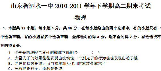山东省泗水一中10-11学年高二下学期期末考试(物理)山东省泗水一中10-11学年高二下学期期末考试(物理)山东省泗水一中10-11学年高二下学期期末考试(物理)