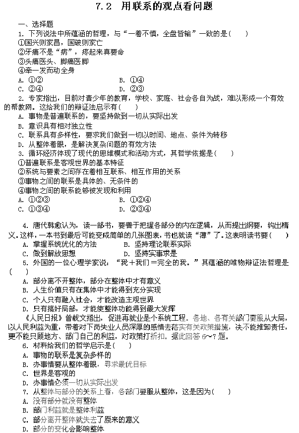 2011高二政治试题:7.2用联系的观点看问题(新人教版必修4)