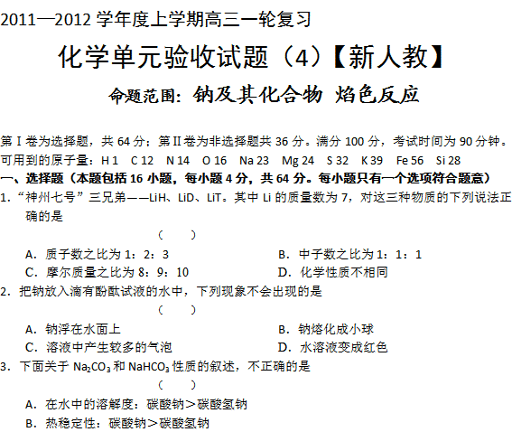 百度:2011-2012学年新课标高三上学期单元测试(4)(化学)