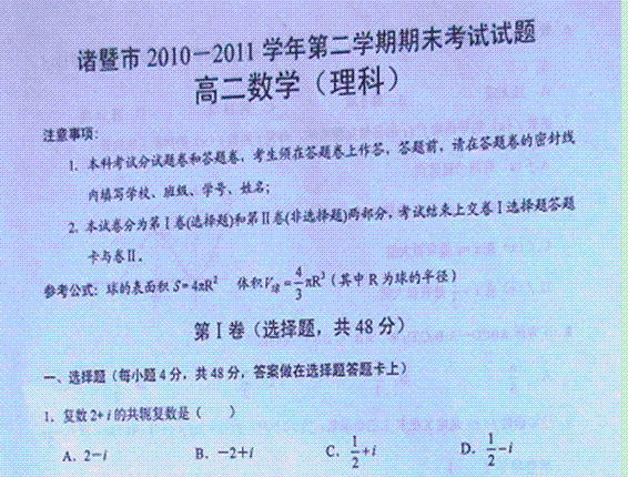 有道:浙江省诸暨市10-11学年高二下学期期末试题扫描版数学理