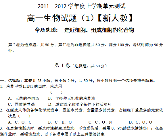 百度:2011-2012学年高一上学期单元测试(1)(生物)
