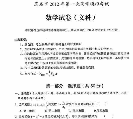 百度:广东省茂名市2012届高三第一次高考模拟试题数学文(扫描版)(无答案)