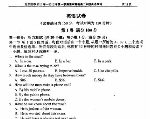 百度:北京四中2011-2012学年高二上学期期末考试英语试题(扫描版)
