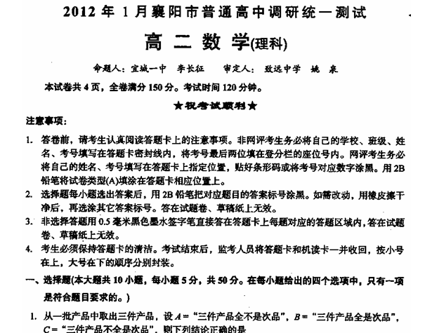 百度:湖北省襄阳市11-12学年高二1月调研考试数学(理)试题(扫描版)