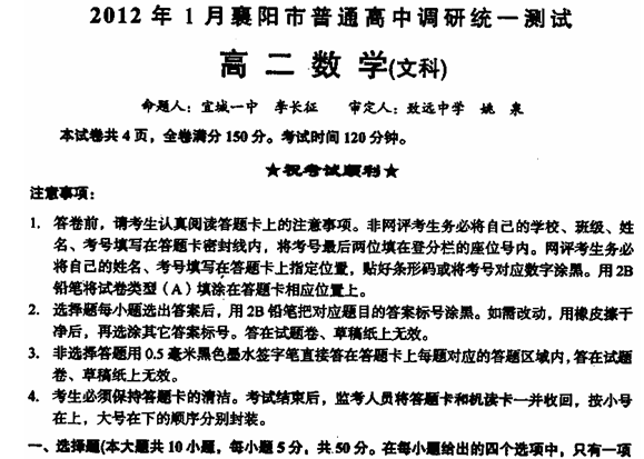 百度:湖北省襄阳市11-12学年高二1月调研考试数学(文)试题(扫描版)