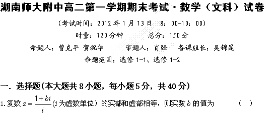 百度:【KS5U首发】湖南师大附中2011-2012学年高二上期期末考试数学(文)试题